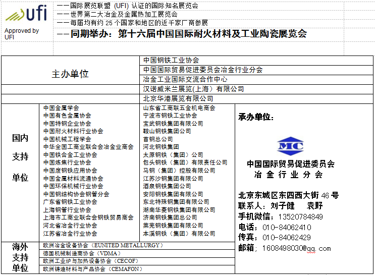主辦方聯(lián)系人;中國(guó)國(guó)際貿(mào)易促進(jìn)委員會(huì)冶金行業(yè)分會(huì) 劉子健 13520784849