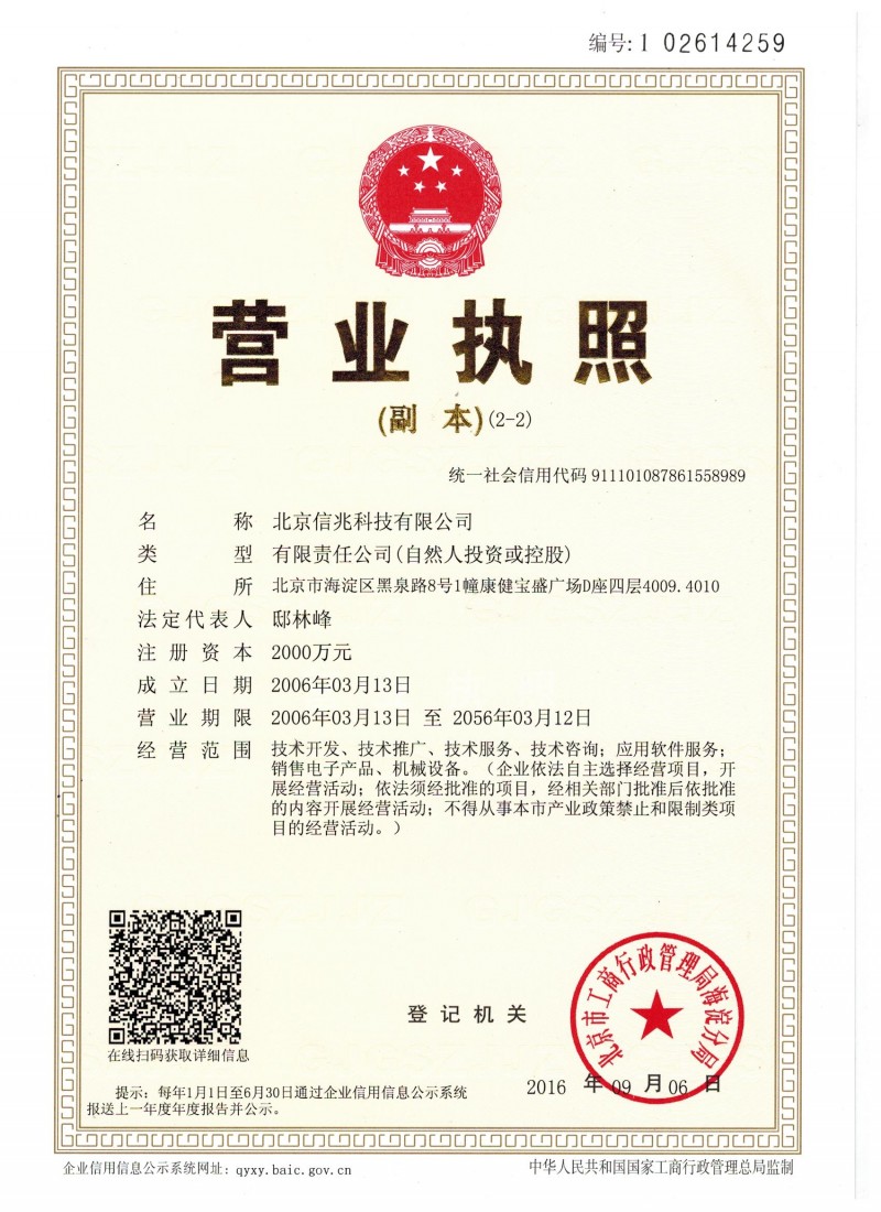 | 發(fā)證機(jī)構(gòu): | 北京市工商行政管理局海淀分局 | 發(fā)證時(shí)間 : | 2016-09-06 |