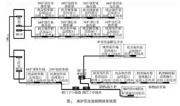 爐頂和礦槽上料生產(chǎn)的自動(dòng)化控制系統(tǒng)網(wǎng)絡(luò)原設(shè)計(jì)為DP 總線,由于施工不規(guī)范,信號(hào)和電氣系統(tǒng)地線布置連接混亂,容易引入干擾源,另外,現(xiàn)場(chǎng)環(huán)境存在粉塵、強(qiáng)電等干擾,這些都對(duì)現(xiàn)場(chǎng)信號(hào)產(chǎn)生不利影響,經(jīng)常導(dǎo)致現(xiàn)場(chǎng)信號(hào)中斷?,F(xiàn)場(chǎng)所有設(shè)備在總線中屬于串聯(lián)結(jié)構(gòu),某個(gè)環(huán)節(jié)一旦中斷,將會(huì)造成后面所有設(shè)備中斷。