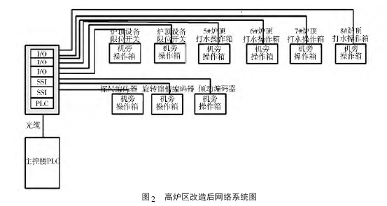 由圖1 可以看到,高爐區(qū)的現(xiàn)場(chǎng)操作箱由Profibus_DP 總線串聯(lián)進(jìn)入PLC 柜,這種串聯(lián)方式存在弊端,即如果其中某一個(gè)操作箱的連接中斷,勢(shì)必造成后面所有操作箱的連接全部中斷,一個(gè)設(shè)備的故障將會(huì)影響其他設(shè)備不能正常運(yùn)行。高爐區(qū)PLC 控制系統(tǒng)改造后的網(wǎng)絡(luò)系統(tǒng)如圖2 所示。