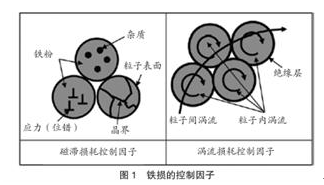 渦流損耗是交變磁場(chǎng)中發(fā)生的渦電流產(chǎn)生的焦耳熱損失。為了降低這種能量損失并防止部件發(fā)熱,應(yīng)對(duì)渦流損耗進(jìn)行控制。渦流損耗有粒子內(nèi)渦流損耗和粒子間渦流損耗。粒子間渦流在跨越粒子間的大范圍內(nèi)流動(dòng),造成的渦流損耗很大。所以為抑制粒子間渦流,在鐵粉粒子表面形成絕緣皮膜。
