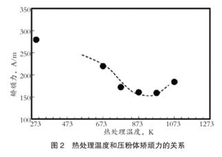 熱處理溫度和壓粉體矯頑力的關(guān)系如圖2。從圖中可知,當(dāng)退火溫度超過927K時(shí),由于發(fā)生再結(jié)晶使晶粒細(xì)化,導(dǎo)致磁滯損耗(矯頑力)增大,所以,將壓粉體退火溫度目標(biāo)值確定為927K。目前,現(xiàn)行的耐熱性絕緣皮膜有磷酸系皮膜、耐熱樹脂皮膜、這兩種材料的復(fù)合皮膜和MgO皮膜,但這些皮膜很難完全滿足上述特性的要求。所以對(duì)新型皮膜不斷進(jìn)行開發(fā)。