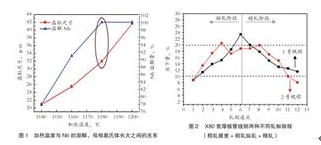 在此采用Irvine公式:l og[Nb][C+12/14N]=-6770/ T+2.16,并結合X80鋼坯成分體系中C、N和Nb含量,計算出Nb完全固溶溫度為1177℃。因此,在綜合考慮Nb的溶解和奧氏體晶粒大小的基礎上,其加熱溫度與Nb的溶解、母相奧氏體長大之間的關系如圖1所示。