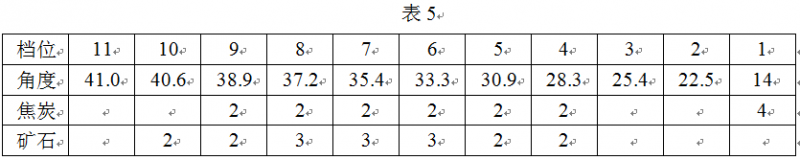 α角是指溜槽與高爐中心線的夾角. 最大礦角(α最大礦) 決定了礦石在正常料線情況下的料面落點(diǎn)與爐墻的距離,對(duì)邊緣氣流的發(fā)展程度起著決定性作用,5號(hào)高爐根據(jù)原燃料條件,利用休風(fēng)機(jī)會(huì)對(duì)爐頂布料器的溜槽角度進(jìn)行了測(cè)定(表5) ,并確定α最大礦48.5º,保持礦石落點(diǎn)與爐墻0.5m 左右的距離。