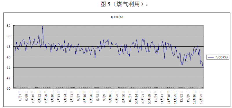 龍鋼5號(hào)高爐將批重由以前的43~45.5t擴(kuò)大到現(xiàn)在的56~57t,實(shí)行大礦批強(qiáng)化冶煉,通過實(shí)行中心加焦技術(shù),穩(wěn)定焦窗平臺(tái),實(shí)行”大α角、大礦角”布料,提高了煤氣利用,實(shí)現(xiàn)了邊緣穩(wěn)定、中心暢通的氣流,取得了良好的技術(shù)經(jīng)濟(jì)指標(biāo)(見圖6) 。