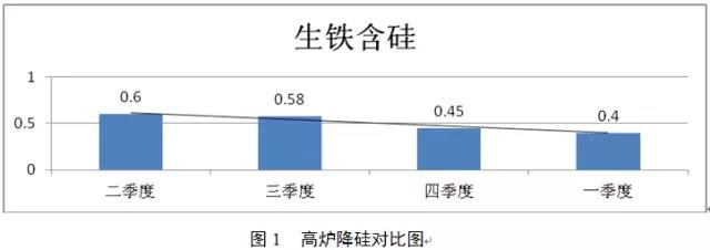 降低生鐵含硅量,有利于高爐提產(chǎn)和降低燃耗。2座高爐在爐況穩(wěn)定,物理熱≥1450℃,保證生鐵合格率的前提上,逐步降低生鐵含硅量,由原來的0.6%左右,穩(wěn)步降到了0.4%左右。