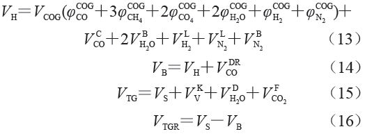 式中:VTG 為爐頂煤氣總量,m3;β 為H2在高爐下部的利用率,取0.4;α 為H2在高爐上部的利用率,取0.25;φTGH2、φTGN2和φTGCO 分別為爐頂煤氣中H2、N2和CO的體積分?jǐn)?shù);V KCO、V KH2和V KN2分別為焦炭揮發(fā)分中CO、H2和N2的體積,m3;V DRCO 為直接還原生成的CO體積,m3;V IRCO 為間接還原消耗的CO體積,m3。