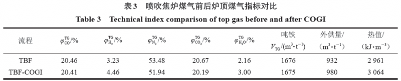 數(shù)學(xué)模型計(jì)算得出的TBF 和TBF- COGI(VCOG=30 m3/t)流程的一些主要技術(shù)指標(biāo)和爐頂煤氣指標(biāo)對(duì)比見表2和表3。