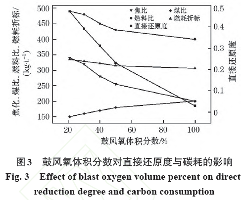 圖3 所示為不同OBF-COGI流程下直接還原度與碳耗變化趨勢(shì)。由圖3可以看到,隨著富氧率的提高,焦比、燃料比和燃耗折標(biāo)都有所下降,直接還原度逐漸降低,全氧鼓風(fēng)時(shí)直接還原度幾乎為0;100%OBF-COGI 流程焦比可低至200 kg/t,噴煤可達(dá)200kg/t,燃耗折標(biāo)為306 kg /t,相較于TBF 的焦比350kg/t,煤比為150 kg/t,燃耗折標(biāo)為338 kg/t,100%OBF-COGI流程可節(jié)焦43%,增煤33%,燃料比降低20%,燃耗折標(biāo)降低9.5%。這主要是因?yàn)樘岣吒谎趼屎螅郀t噴吹的焦?fàn)t煤氣量增加,其置換燃料比的作用逐漸明顯,高爐各區(qū)域CO和H2濃度升高,爐身鐵礦石間接還原發(fā)展較為充分,降低了鐵礦石的直接還原度,爐身循環(huán)煤氣的噴入,實(shí)現(xiàn)了還原劑的循環(huán)利用,使高爐碳耗降低。