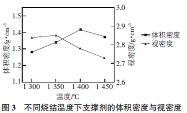 圖3 表示各燒結(jié)溫度下陶粒支撐劑的體密度及視密度變化曲線。從圖3 中能夠看出隨著燒結(jié)溫度的提高( 1 300 ℃ ~1 450 ℃) ,支撐劑的體積密度先增大后減小,而視密度呈現(xiàn)先略微增大后逐漸降低的趨勢(shì)。結(jié)合SEM 分析可知,隨著燒結(jié)溫度的升高,莫來(lái)石晶體逐漸長(zhǎng)大,產(chǎn)生少量的液相填充晶間氣孔,顯氣孔率減小,體積密度就會(huì)有增大的趨勢(shì),同時(shí)液相的產(chǎn)生使得視密度有所下降。燒結(jié)溫度繼續(xù)升高,莫來(lái)石晶體的長(zhǎng)大伴隨一定的體積膨脹,出現(xiàn)的閉氣孔率增大,導(dǎo)致體積密度和視密度都有下降的趨勢(shì)。1 400 ℃ 燒結(jié)制備的支撐劑的體積密度達(dá)到最大值,為1. 416 g /cm3 ,仍然符合SY/T 5108—2014 中國(guó)石油天然氣行業(yè)標(biāo)準(zhǔn)的要求,即低密度陶粒支撐劑的體積密度不大于1. 5 g /cm3。而1 350 ℃燒結(jié)制備的支撐劑的視密度達(dá)到最大值,為2. 85 g /cm3 ,仍然符合此行業(yè)標(biāo)準(zhǔn)的要求,即低密度陶粒支撐劑的視密度不大于3 g /cm3。