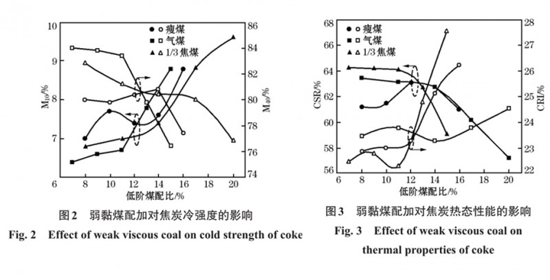 寬炭化室、多段加熱的大容積焦?fàn)t工藝技術(shù)實(shí)現(xiàn)了以下功能:(1)燃燒室采用3段式加熱方法,實(shí)現(xiàn)高向均勻加熱。炭化室高向溫度差在50 ℃以內(nèi),長向均勻系數(shù)大于0.9,氮氧化物排放量降低至450 mg/m 3(標(biāo)準(zhǔn)態(tài))以下,解決了爐頂空間溫度高、化產(chǎn)收率低的技術(shù)難題;(2)采用節(jié)能型焦?fàn)t蓄熱室封墻,有效提高了爐體密封性;采用新型格子磚,提高了預(yù)熱煤氣和空氣的溫度;(3)通過建立煤氣流量、標(biāo)準(zhǔn)溫度、空氣過剩系數(shù)、煤氣熱值與焦?fàn)t溫度的關(guān)系模型,確定了不同結(jié)焦時(shí)間的最低標(biāo)準(zhǔn)溫度,實(shí)現(xiàn)噸焦煤氣耗量降低至195 m 3(標(biāo)準(zhǔn)態(tài))以下;(4)通過煤種配煤優(yōu)化試驗(yàn)和低價(jià)煤極限配加試驗(yàn),確定了典型的氣煤、1/3焦煤和瘦煤的極限配加比例(圖2、圖3),進(jìn)而得到適合寬炭化室7 m焦?fàn)t的合理配煤結(jié)構(gòu)。弱黏煤配比達(dá)到44.1%,焦炭的M 40 、M 10 和CSR分別達(dá)到90.24%、5.97%和68.14%,滿足了大高爐煉鐵的要求。