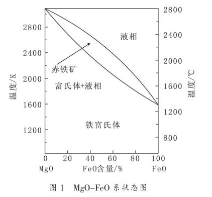 球團礦的高溫性能主要取決于[5,9] 球團礦還原過程中核心部位存在著的富氏體及其熔融性能。富氏體能夠與渣相成分發(fā)生反應生成低熔點的液相, 改善球團礦高溫性能的根本途徑即提高渣相和富氏體的熔融溫度區(qū)間, MgO 的加入可以起到這個作用。 MgO-FeO 系狀態(tài)圖如圖 1[5,8-9]所示。