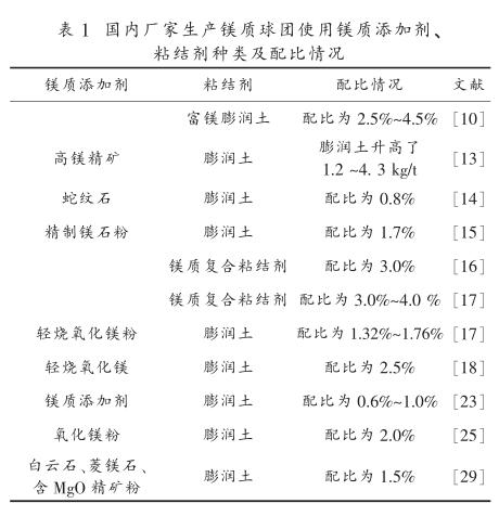 由于隨著球團礦中 MgO 含量的增加,生球強度有所降低,焙燒球強度也有所下 [10],為了提高強度需相應增加粘結劑的使用量。 粘結劑為膨潤土時,增加其使用量會引起球團礦鐵品位降低,使SiO 2 及其他雜質的含量升高, 高爐渣量也相應增加;粘結劑為有機復合粘結劑時,雖可以提高球團礦鐵品位、降低 SiO 2 及其他雜質的含量,但價格較貴,限制了推廣應用。 表 1 為國內廠家生產(chǎn)鎂質球團礦使用的鎂質添加劑、粘結劑種類及配比情況。