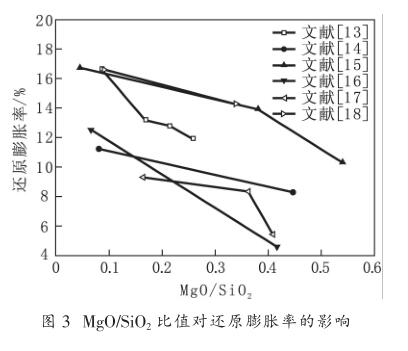 由圖 3 可見,文獻 13~18 中鎂質球團礦的還原膨脹率均隨 MgO/SiO 2 比值的增大而逐漸降低。當球團礦中 Fe 2 O 3 還原成 Fe 3 O 4 時,晶格變化產(chǎn)生楔形膨脹裂紋,晶格開裂產(chǎn)生體積膨脹,若膨脹應力大于球團礦固有的機械強度, 球團礦將自行破碎與粉化[8、10]。 球團礦中添加 MgO 后,通過氧化焙燒過程產(chǎn)生較多的鐵酸鎂, Mg 2+ 會均勻分布在富氏體內,進而導致在還原反應過程中 Fe 2 O 3 轉變?yōu)?Fe 3 O 4 ,晶格變化小,膨脹應力減弱,體積膨脹降低。另一方面, MgO可以使 2CaO · SiO 2 相穩(wěn)定溫度區(qū)間提高, 當球團礦中 MgO 含量升高時,球團礦的膨脹率降低。