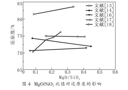 由圖 4 可見,文獻13 、16 、18中球團礦還原度隨MgO/SiO 2 比值的增大而提高,文獻14、17 中還原度隨 MgO/SiO 2 比值的增大而小幅度降低。球團礦還原性受氣孔率及渣相中難還原的鐵橄欖石和鈣鐵橄欖石含量影響較大,文獻13、18 中還原度提高主要由于渣相中難還原的鐵橄欖石和鈣鐵橄欖石含量減少;文獻16中還原度提高是因為使用了有機粘結劑,在氧化焙燒過程中大量氣體提高了球團孔隙度,進而改善了鎂質球團礦的還原性能;文獻14中鎂質添加劑為蛇紋石,引入過多 SiO 2 造成渣相中難還原的鐵橄欖石含量增多;文獻17還原度降低主要受渣相中難還原的鈣鐵橄欖石含量增加的影響。