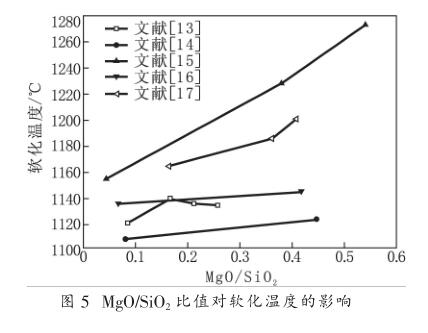 由圖 5 可見,文獻 13~17 中球團礦的軟化溫度(料層收縮 10% 時的溫度)均隨 MgO/SiO 2 比值的增大而升高,酸性球團礦的高溫冶金性能主要取決于高溫還原過程中,球團核心未還原層中存在的富氏體,與渣相發(fā)生反應而生成的低熔點渣相。 隨著球團礦中 MgO 含量的增加[ 8-9 ],鎂固溶體提高了渣相的熔融溫度,鎂富氏體的形成提高了富氏體的熔化溫度,同時MgO固溶于富氏體還可抑制FeO向渣內溶解,減少了低熔點液相的生成量。