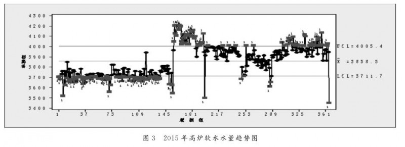 2016 年 2 月 能 源 中 心 水 站 改 造,水 壓 由576kPa降至537kPa,水量達到3600m3/h左右,改造后水壓596kPa ,高爐水量3900m3/h ,仍未達到設(shè)計水量,高爐冷卻壁溫度雖出現(xiàn)短期穩(wěn)定,但仍呈上升趨勢(圖 6 )。