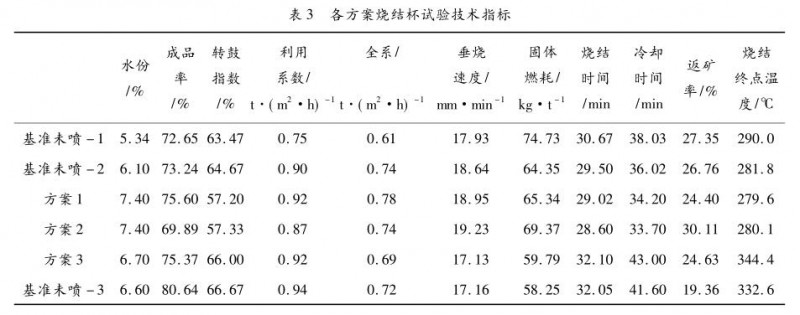 ( 2) 方案 1 比 2 的成品率高 5. 7%,說明蒸汽噴吹位置太靠前會影響成品率,這應(yīng)是由于點(diǎn)火后料層紅層相對較薄,蒸汽接觸紅層后進(jìn)行吸熱反應(yīng),導(dǎo)致表層質(zhì)量變差形成返礦。