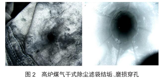 在高爐煤氣干式除塵系統(tǒng)運行維護中發(fā)現(xiàn),干式除塵濾袋頻繁發(fā)生磨損穿孔現(xiàn)象,其濾袋穿孔部位多出現(xiàn)在第一節(jié)防癟環(huán)下部位置,布袋破口為 T字形或一字形,,破口大小約 1~15 mm。經(jīng)分析因高爐冶煉過程中因爐況波動,出現(xiàn)煤氣含水量高或煤氣溫度異常偏低時,極易引起除塵系統(tǒng)濾袋內(nèi)表面瓦斯灰結(jié)垢,形成體積較大的垢塊掛在布袋內(nèi)壁上,引起入口煤氣氣流方向發(fā)生改變,引起布袋局部沖刷磨損;并且,在長時間布袋過濾和加壓反吹的過程中,垢塊會直接摩擦濾袋,導(dǎo)致濾袋局部強度減弱,濾袋發(fā)生穿孔破損現(xiàn)象,導(dǎo)致出口高爐煤氣含塵量超標(biāo)。