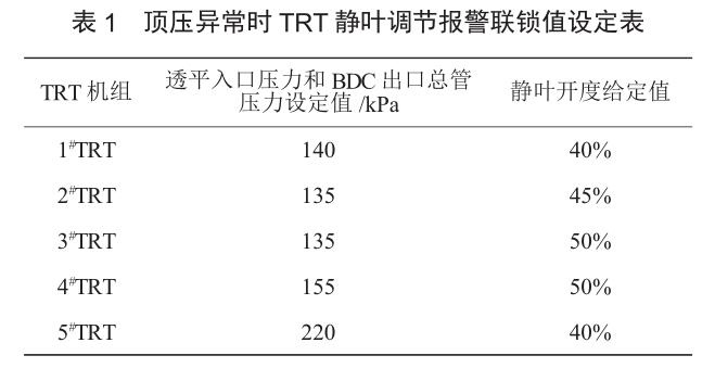 增設(shè)透平入口壓力和 BDC 出口總管壓力(兩點)與 TRT 靜葉聯(lián)鎖調(diào)節(jié)程序:當(dāng)透平入口壓力和BDC 出口總管壓力兩點同時高于設(shè)定值時,發(fā)出聲光報警,且靜葉調(diào)節(jié)退出自動模式,轉(zhuǎn)為手動模式,同時靜葉開度自動調(diào)整到給定值。5 臺 TRT機組具體設(shè)定值如表 1。