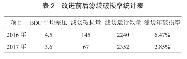 (3)與布袋生產(chǎn)廠家進行溝通,優(yōu)化布袋易損部位縫制工藝質(zhì)量,降低布袋反吹破損率。并結(jié)合每周2 次 BDC 筒體煤氣粉塵人工取樣檢測,有效監(jiān)控布袋改進后的除塵系統(tǒng)運行質(zhì)量。