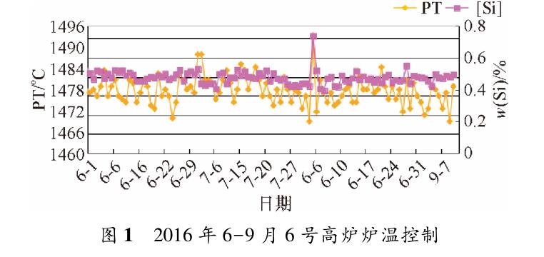 因?yàn)樯V軟化溫度低,易粘結(jié)爐墻引起爐況順行變差.生礦比例增加后,要做到低硅不低熱,須綜合運(yùn)用風(fēng)溫、富氧等手段,保證理論燃燒溫度在合適范圍,韶鋼 6 號高爐理論燃燒溫度一般在 2 150 ℃.嚴(yán)格控制好爐渣堿度,保證爐渣具有良好的流動性,要求爐渣堿度在 1. 20~1. 25.對爐渣成分及實(shí)際流動性進(jìn)行跟蹤分析,當(dāng)發(fā)現(xiàn)在爐渣溫度與鐵水含硅不匹配,渣流變差,渣中 w( Al 2 O 3 ) 含量>16!時,可以適當(dāng)配加錳礦或者白云石,以改善爐渣流動性,提高爐缸活躍度.在熱制度方面,硅按 0. 35!~0. 55!控制,鐵水含硫按 0. 020!~0. 035!控制,鐵水溫度按 1 470~1 490 ℃控制.控制好與風(fēng)壓關(guān)系匹配的頂壓,一般風(fēng)壓在 300 kPa,頂壓設(shè)置為 166 kPa,保證壓差在 130~140 kPa.爐溫控制見圖 1 所示.