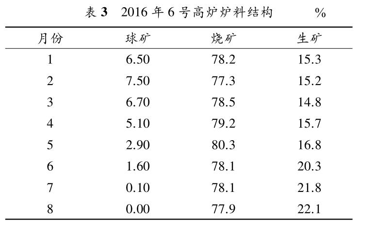 提高入爐生礦比例后,高爐爐料結(jié)構(gòu)發(fā)生了明顯的變化.2016 年 6 月開始,韶鋼 6 號高爐以塊帶球,入爐塊礦由 17!逐步提高至 22!,球礦由 5!減少至零,以價格相對便宜的塊礦替代了價格昂貴的球團(tuán)礦,取得了較好的經(jīng)濟(jì)效益.爐料結(jié)構(gòu)變化如表3 所示.