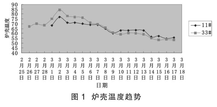 爐缸溫度監(jiān)測(cè)是確保爐缸安全的重要手段。進(jìn)一步加強(qiáng)高爐爐缸側(cè)壁電偶、爐殼測(cè)溫、水溫差監(jiān)測(cè)等手段的控制,以便對(duì)爐缸安全運(yùn)行狀態(tài)進(jìn)行掌控。二層爐殼由原來(lái) 8 個(gè)監(jiān)測(cè)點(diǎn)增加到32 個(gè),三層由原來(lái) 8 個(gè)監(jiān)測(cè)點(diǎn)增加到 27 個(gè)。正常情況下要求相關(guān)崗位每四個(gè)小時(shí)檢測(cè)記錄一次并記錄在電腦上,特別電偶和爐殼溫度相對(duì)高的部位重點(diǎn)監(jiān)測(cè),發(fā)現(xiàn)異常時(shí)及時(shí)上報(bào)處理。在南北爐基方向加裝兩個(gè)攝像監(jiān)控并在爐殼溫度高的點(diǎn)安裝 20 個(gè)爐殼溫度在線實(shí)時(shí)監(jiān)控。2018年 3 月份二層爐殼溫度較高點(diǎn) 11# 和 33# 變化趨勢(shì)見(jiàn)圖 1。