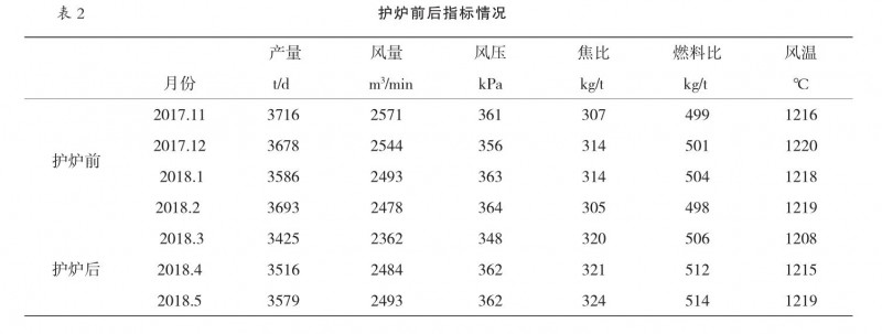 通過(guò)以上措施,5 號(hào)高爐取得很好護(hù)爐效果,不僅確保維持安全生產(chǎn),而且各項(xiàng)經(jīng)濟(jì)技術(shù)指標(biāo)保持較好水平,護(hù)爐前后各項(xiàng)指標(biāo)見(jiàn)表 2。