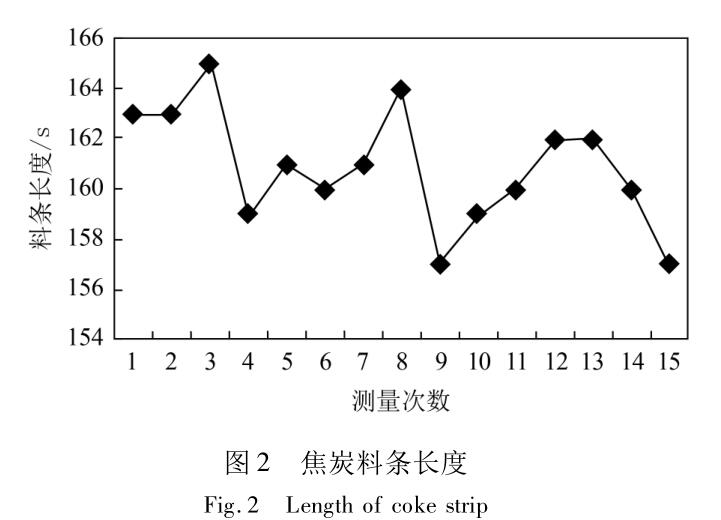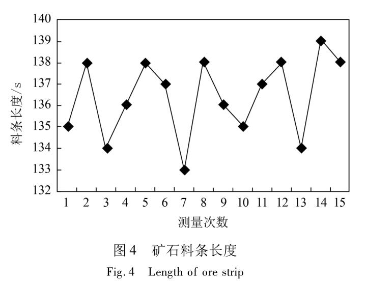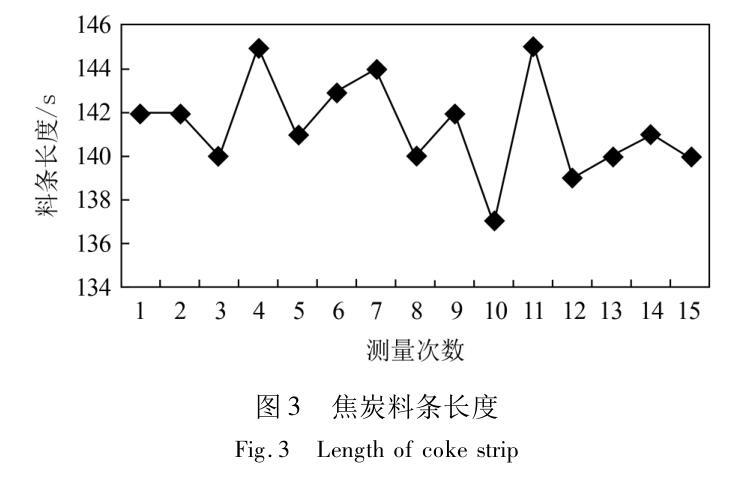 針對上述改造方案,對我廠 B 高爐逐步進(jìn)行改造,首先調(diào)整燒結(jié)礦排料間隔時(shí)間,現(xiàn)場將 2A -10A 共9 個(gè)倉縮短2 s 時(shí)間,現(xiàn)場測試料條效果較明顯。實(shí)測現(xiàn)場礦石物料基本頭尾相接無明顯空擋,但在連接處仍有窄料條。隨即將時(shí)間再次調(diào)整 1 s,測試現(xiàn)場物料基本按要求重疊且料條寬度基本一致,已達(dá)到預(yù)期效果。焦炭倉將現(xiàn)場閘門開度調(diào)整到最大后,將 8B - 2B 共 7 個(gè)倉間隔時(shí)間縮小 3 s,并記錄 15 批時(shí)間。實(shí)側(cè)平均料條長度為 14. 1 s,礦石長度為 136. 4 s,詳見圖 3、圖 4。
