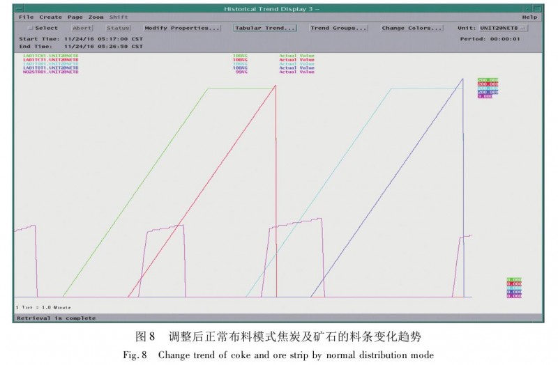 調(diào)整后因高爐爐況波動(dòng)曾出現(xiàn) 1 次較大的塌料,其中最深尺料線達(dá) 4. 3 m。按調(diào)整前上料能力需近2 h 可恢復(fù)料線,實(shí)際僅經(jīng)1 h 15 min 即達(dá)到設(shè)定料線。同時(shí),2016 年 11 月開始測試分割布料,即C /O /O 布料模式(即焦/礦1/礦2 ),此種情況下較前每批上料多 1 批礦石(圖 6 ~ 8)。之前上料能力無法滿足基本上料,在調(diào)整后滿足了生產(chǎn)工藝要求。