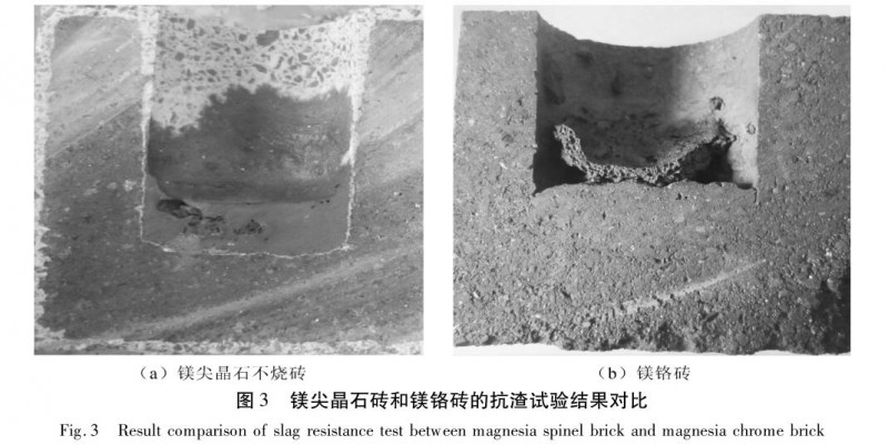 通過試驗,結(jié)合鎂鉻磚的使用經(jīng)驗,下部槽采用與浸漬管相同編號的 RW2 高檔鎂尖晶石不燒磚,圖3 為鎂尖晶石不燒磚和鎂鉻磚的靜態(tài)抗渣試驗結(jié)果對比。