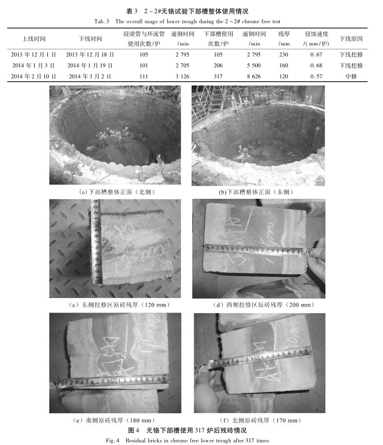2013 年底至2014 年3 月在首鋼京唐公司2 -2#RH 真空室試驗了由無鎂尖晶石磚砌筑的下部槽,原磚厚度為 300 mm。表 3 和圖 4 為該無鉻下部槽的使用情況和下線照片。