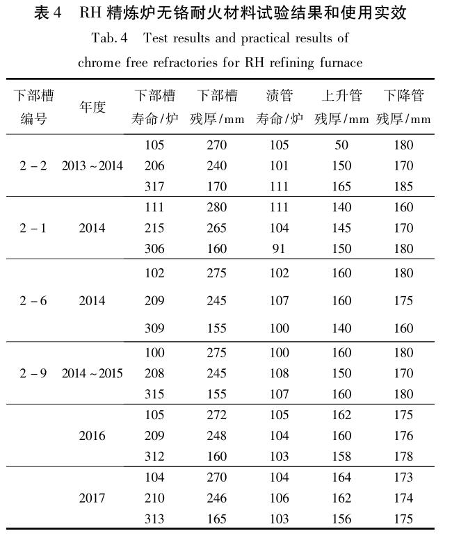 首鋼京唐公司煉鋼作業(yè)部 2013 年底開始進(jìn)行RH 精煉爐無鉻耐火材料工業(yè)試驗,試驗結(jié)果和使用實效詳見表 4。