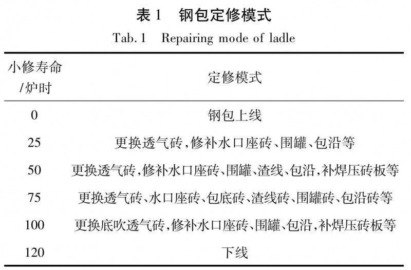 首鋼京唐公司300 t 鋼包內(nèi)襯耐火材料的包底、包壁工作層采用剛玉質(zhì)無碳磚,渣線工作層采用低碳鎂碳磚,設(shè)計使用壽命 120 次。鋼包的定修模式主要考慮透氣磚、水口座磚與渣線磚、包壁磚相匹配。具體定修模式如表 1 所示,穩(wěn)定的定修模式可以有效地降低鋼包的安全隱患和異常下線,加快鋼包的周轉(zhuǎn)和使用,確保鋼水潔凈度和鋼水成分的穩(wěn)定,也可以減少鋼包周轉(zhuǎn)慢和異常下線對煉鋼產(chǎn)量的影響。