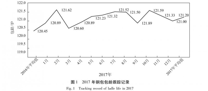 經(jīng)過調(diào)整定修模式、改進鋼包砌筑工藝和烘烤制度,鋼包的在線安全使用性能明顯提高,異常下線的數(shù)量明顯減少,由鋼包安全隱患和異常下線對生產(chǎn)造成影響的數(shù)量明顯減少,鋼包包齡進一步提高。如圖 1 所示,鋼包的包齡由 2016 年平均值 120.45爐提高到 2017 年平均的 121.20 爐。