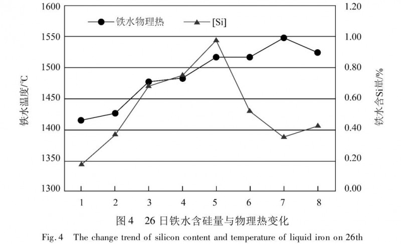 26 日發(fā)現(xiàn)退負荷效果不明顯,爐內氣流仍無法控制,管道、塌料頻繁,料尺工作差,爐溫低,開始加集中焦處理爐況。分別于第 5 批料附加 2 批焦炭,第 10 批開始每隔 5 批附加 1 整批焦炭,實際焦炭負荷 3. 8,隨著附加焦的逐步作用,爐內關系明顯見好,管道、塌料現(xiàn)象減少,料尺工作好轉,爐溫逐漸上行,爐缸工作狀態(tài)好轉。爐內開始向上逐步平衡風量,至 26 日 23:00,風量已平衡到 6 900 m3 /min,透氣性指數(shù) 4 000,風溫1 000 ℃,爐溫0.42%,鐵水物理熱 1 524 ℃(圖 4),爐內冷氣流基本已消除,軟熔帶煤氣分布恢復正常,爐缸熱制度達到正常水平。于27 日38 批開始取消附加焦,每批焦炭從 32. 9 t/p增加到35.9 t/p,負荷為 4.16;60 批焦炭從 35. 9 t/p降到34.9 t/p,礦批150 t/p 增至155 t/p,負荷 4.56,爐內關系平穩(wěn),料尺工作好;至27日13: 00,風量8200 m3 /min,透氣性指數(shù)4 190,富氧率 2%,風溫1 135 ℃,爐內關系平穩(wěn),爐況基本恢復正常,操作參數(shù)見圖 5。