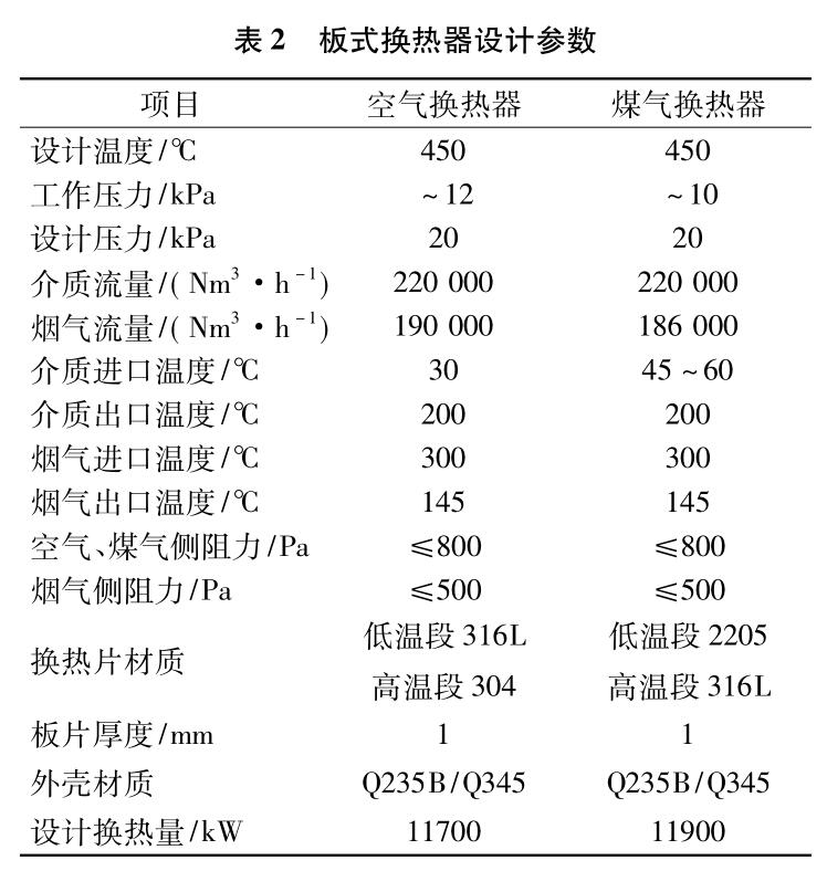 1) 將兩臺(tái)熱管換熱器( 空氣、煤氣) 拆除,更換為板式換熱器( 空氣、煤氣) ,板式換熱器的參數(shù)見(jiàn)表 2。