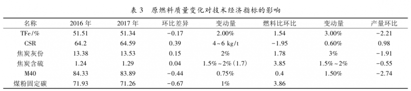 從表 3 看出,燃料比與 2016 年環(huán)比升高、產(chǎn)量環(huán)比下降的主要原因:一是入爐品位環(huán)比降低0.17%,造成燃料比上升;二是焦炭綜合質(zhì)量整體劣化,且焦化酚氰廢水處理能力不足,4 月開(kāi)始焦炭干熄焦率維持在 60% ~70%;三是煤粉固定碳環(huán)比降低 0.67%,影響燃料比上升;四是高爐入爐原燃料質(zhì)量頻繁波動(dòng),導(dǎo)致燃料比升高。