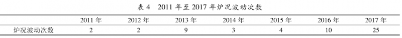 高爐技術(shù)經(jīng)濟(jì)指標(biāo)劣化的原因是爐況不順,而導(dǎo)致?tīng)t況不順的決定性因素是原燃料條件的劣化,通過(guò)分析 2017 年酒鋼高爐爐況變化,總結(jié)出原燃料條件劣化對(duì)高爐爐況的影響。2011 年 -2017 年酒鋼高爐爐況波動(dòng)次數(shù)如表 4 所示。