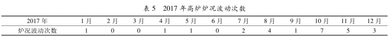 從表 4 看出,酒鋼高爐爐況波動(dòng)次數(shù)呈現(xiàn)遞增趨勢(shì),2016 年、2017 年?duì)t況波動(dòng)次數(shù)分別高達(dá) 10次、25 次,其中 2016 年 11 月至 2017 年 5 月 4 號(hào)高爐開(kāi)爐后爐況長(zhǎng)期不順,造成 2016 年、2017 年堵風(fēng)口恢復(fù)爐況分別為 5 次、6 次,扣除影響高爐爐況波動(dòng)次數(shù)較高的年份分別為 2016 年 5 次、2017 年 19次。取 2017 年?duì)t況進(jìn)行分析,1 月 -12 月份爐況波動(dòng)次數(shù)如表 5 所示。