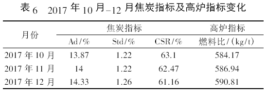 ⑶受神華烏達(dá)肥煤供料不足、榆鋼調(diào)用焦炭影響,2017 年10 月以來(lái)焦炭質(zhì)量較前期不同程度下降(表6),灰分、硫分上升及強(qiáng)度下降對(duì)高爐穩(wěn)定順行及技術(shù)經(jīng)濟(jì)指標(biāo)造成影響。首先焦炭強(qiáng)度下降導(dǎo)致高爐爐內(nèi)透氣性變差,影響煤氣流穩(wěn)定,造成10月-12 月高爐堵風(fēng)口恢復(fù)爐況次數(shù)增加。綜上所述,2017 年下半年以來(lái),原燃料價(jià)格大幅上漲、質(zhì)量劣化,高爐入爐性價(jià)比較低的原燃料對(duì)煉鐵廠技術(shù)經(jīng)濟(jì)指標(biāo)優(yōu)化、高爐壽命及穩(wěn)定順行帶來(lái)不利影響,酒鋼高爐指標(biāo)優(yōu)化及成本降低空間受限,高爐適應(yīng)外圍原燃料質(zhì)量劣化已接近底線,高爐況波動(dòng)增加了安全生產(chǎn)的難度,不符合安全生產(chǎn)管理要求。因此,改善并穩(wěn)定原燃料條件,維持高爐長(zhǎng)周期穩(wěn)定順行勢(shì)在必行,是綜合利用周邊資源的需要,更是降低生產(chǎn)成本、創(chuàng)造經(jīng)濟(jì)效益的需要。