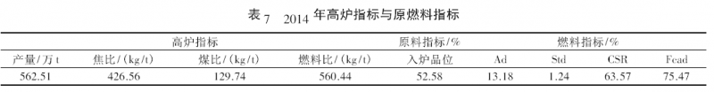 通過(guò)2009 年至2017 年酒鋼高爐產(chǎn)量及燃料比對(duì)比分析,2014 年入爐焦比426. 56 kg /t,煤比129.74 kg /t,燃料比最低560. 44 kg /t,產(chǎn)量562. 51萬(wàn)t(較好水平),原燃料指標(biāo)目標(biāo)值參考酒鋼2014年原燃料質(zhì)量指標(biāo)如表7 所示。