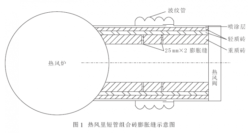 煉鐵總廠7# 和11# 高爐破損的熱風(fēng)里短管組合磚膨脹設(shè)計(jì)不合理。圖1 為熱風(fēng)里短管組合磚膨脹縫示意圖。7# 高爐熱風(fēng)里短管長(zhǎng)度3 631 mm,11# 高爐熱風(fēng)里短管長(zhǎng)度為3 860 mm , 管道長(zhǎng)度很短,其組合磚膨脹縫均設(shè)計(jì)為2 道,尺寸為25 mm/道。由于膨脹縫過于集中且單個(gè)膨脹縫尺寸過大,在應(yīng)力作用下,膨脹縫被拉大造成熱風(fēng)竄入,導(dǎo)致波紋補(bǔ)償器表面溫度過高,長(zhǎng)期使用產(chǎn)生破損。