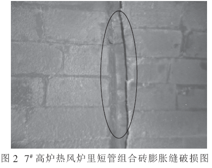 2016 年8 月,7# 高爐2# 熱風(fēng)爐停爐檢修,在熱風(fēng)里短管組合磚拆除時(shí), 對(duì)破損的波紋補(bǔ)償器及組合磚膨脹縫進(jìn)行數(shù)據(jù)檢測(cè), 發(fā)現(xiàn)組合磚膨脹縫上半圓最大縫隙為42 mm, 明顯大于設(shè)計(jì)膨脹量(25 mm),下半圓最小縫隙為12 mm,小于設(shè)計(jì)膨脹量, 膨脹縫發(fā)生明顯變化。通過該數(shù)據(jù)的檢測(cè), 進(jìn)一步驗(yàn)證了熱風(fēng)里短管波紋補(bǔ)償器的破損原因。圖2 為7# 高爐熱風(fēng)爐里短管組合磚膨脹縫破損圖。
