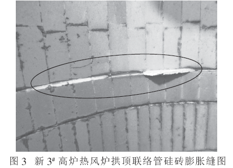 新3# 高爐熱風(fēng)爐拱頂聯(lián)絡(luò)管硅磚的膨脹縫設(shè)計(jì)為4 道:與硅質(zhì)券口磚連接處膨脹縫2 道,尺寸為50 mm/道; 聯(lián)絡(luò)管波紋張力處膨脹縫2 道,尺寸為15mm/道。而拱頂聯(lián)絡(luò)管硅質(zhì)組合磚的砌筑長(zhǎng)度為3 050 mm,按照硅磚的晶相變化, 1 000 ℃的最大線性體積變化為1.5%,則其膨脹量最大為3 050×1.5%=45.75 mm。新3# 高爐拱頂硅質(zhì)組合磚的預(yù)留膨脹量為50+50+15+15=130 mm。該膨脹縫預(yù)留過大,且過于集中,造成使用過程中該部位形成熱風(fēng)通道, 當(dāng)熱風(fēng)接觸管皮后, 造成管皮紅熱。新3# 高爐熱風(fēng)爐拱頂聯(lián)絡(luò)管硅磚膨脹縫如圖3 所示。停爐檢修時(shí)發(fā)現(xiàn)50 mm 的膨脹縫根本無變化,進(jìn)一步說明了硅磚膨脹縫預(yù)留過大。