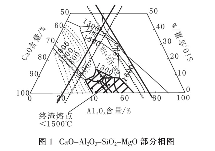 渣的氧化性主要與渣中 FeO 、 MnO 的含量有關,因此,將改質(zhì)后爐渣的主要成分選定在 CaO-Al2 O3 -SiO2 -MgO 相圖中 12CaO·7Al2O3的生成區(qū)域,因為此區(qū)域 Al2O3的含量為 30%~40%,堿度為5~8 ,吸收 Al2O3的能力較強[5]。圖 1 為 CaO-Al2 O3 -SiO2 -MgO部分相圖,圖中陰影處為12CaO ·7Al2O3 ,實線三角型交叉區(qū)域為原渣系成分。優(yōu)化渣系時,提高了渣中CaO和Al2O3 的含量,將渣系成分向圖 2 中虛線三角形內(nèi)靠攏, 即更加接近12CaO·7Al2O3 區(qū)域。 同時,需要控制 CaO 在飽和區(qū),將 CaO/Al2O3控制在 1.8~2.0 。