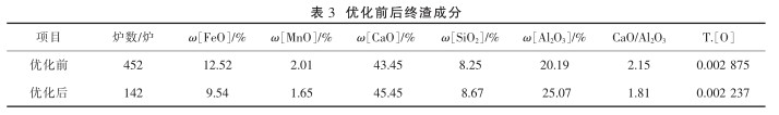 頂渣渣系及改質(zhì)劑加入量優(yōu)化前后的終渣成分對比見表 3 。 由表 3 可見,優(yōu)化后,渣中 FeO 含量由 12.52% 降至 9.54% , MnO 含量由 2.01% 降至1.65% , 渣中氧化性降低。 CaO/Al2O3由 2.15 降至1.81 ,吸附夾雜的能力增強。 中間包 T.[O]含量由0.002 875% 降至 0.002 237% ,鋼水潔凈度得到了提高。