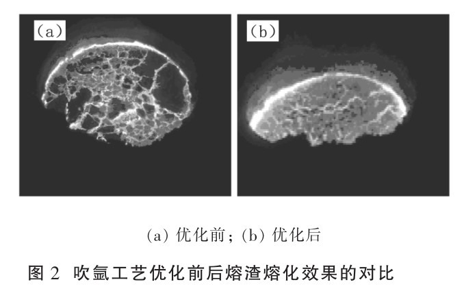吹氬工藝優(yōu)化前后熔渣熔化效果的對比見圖 2 。由圖 2 可見,吹氬工藝優(yōu)化后,鋼水表面熔渣改質(zhì)劑及小粒白灰充分熔化。