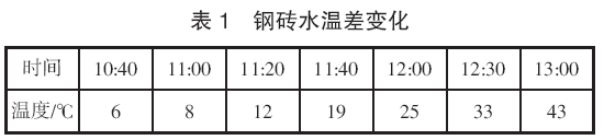 2014 年1 月17 日10 點40 分放料后發(fā)現(xiàn)料線較深,正常料線設定1.3 m/1.3 m,放完焦后為1.8 m/1.8 m,之后連續(xù)放料料線恢復正常。此時發(fā)現(xiàn)布料時β 電流變小,β 電流為10~11 A,正常布料時在14~15 A;從爐頂攝像看中心火焰變弱,12:00 中心火苗消失;爐喉鋼磚水溫差不斷升高,從6 ℃一直升高至到43 ℃(見表1)。